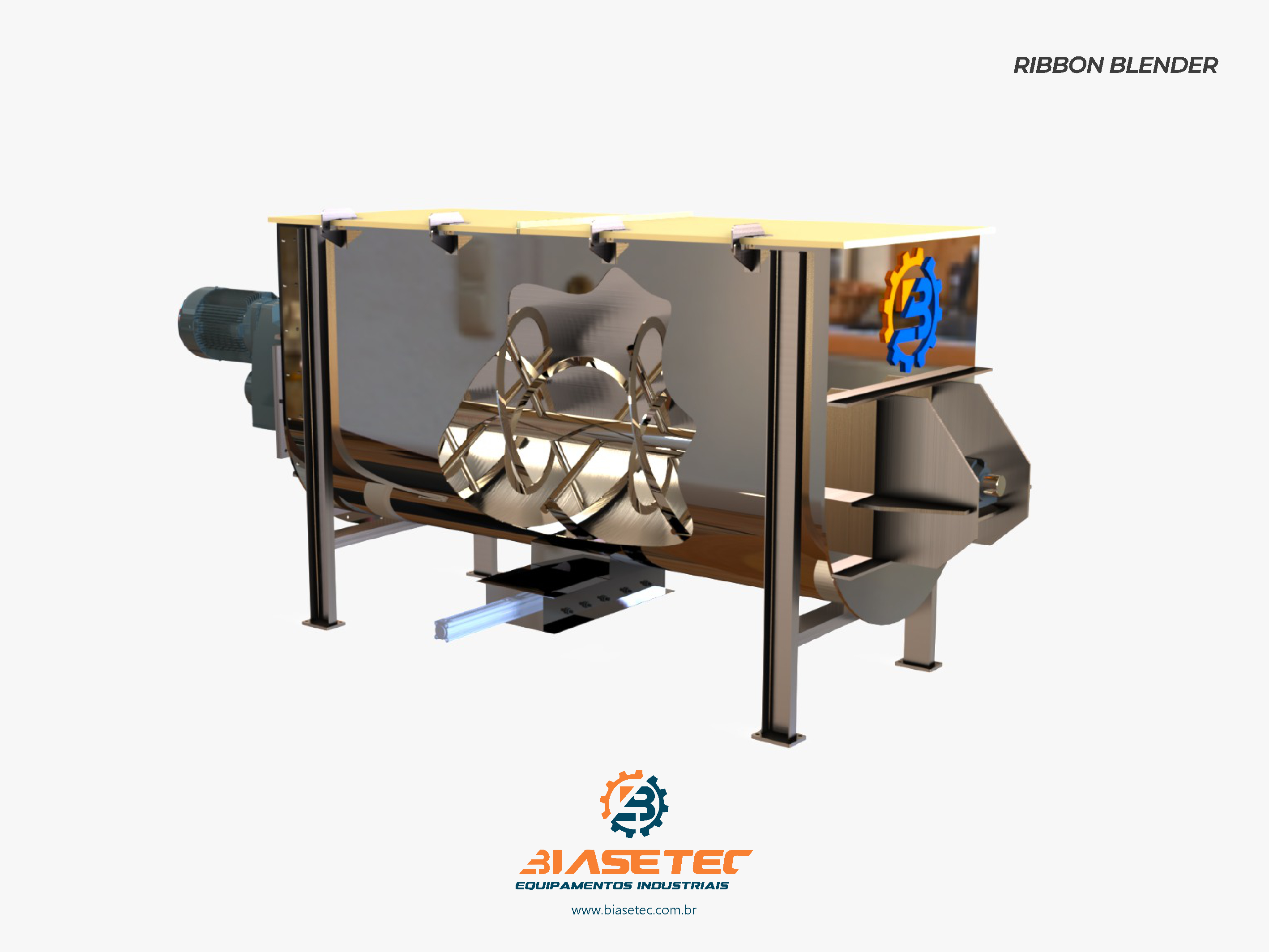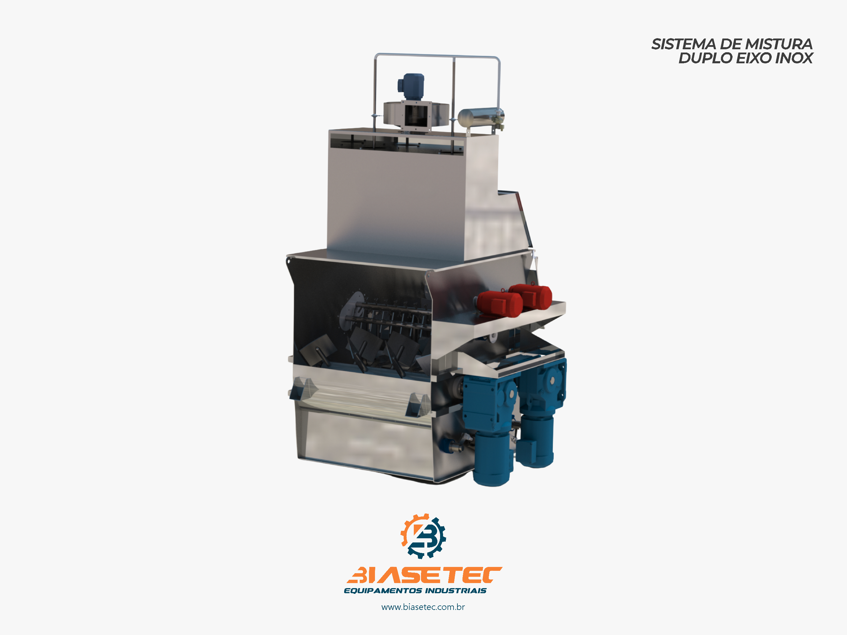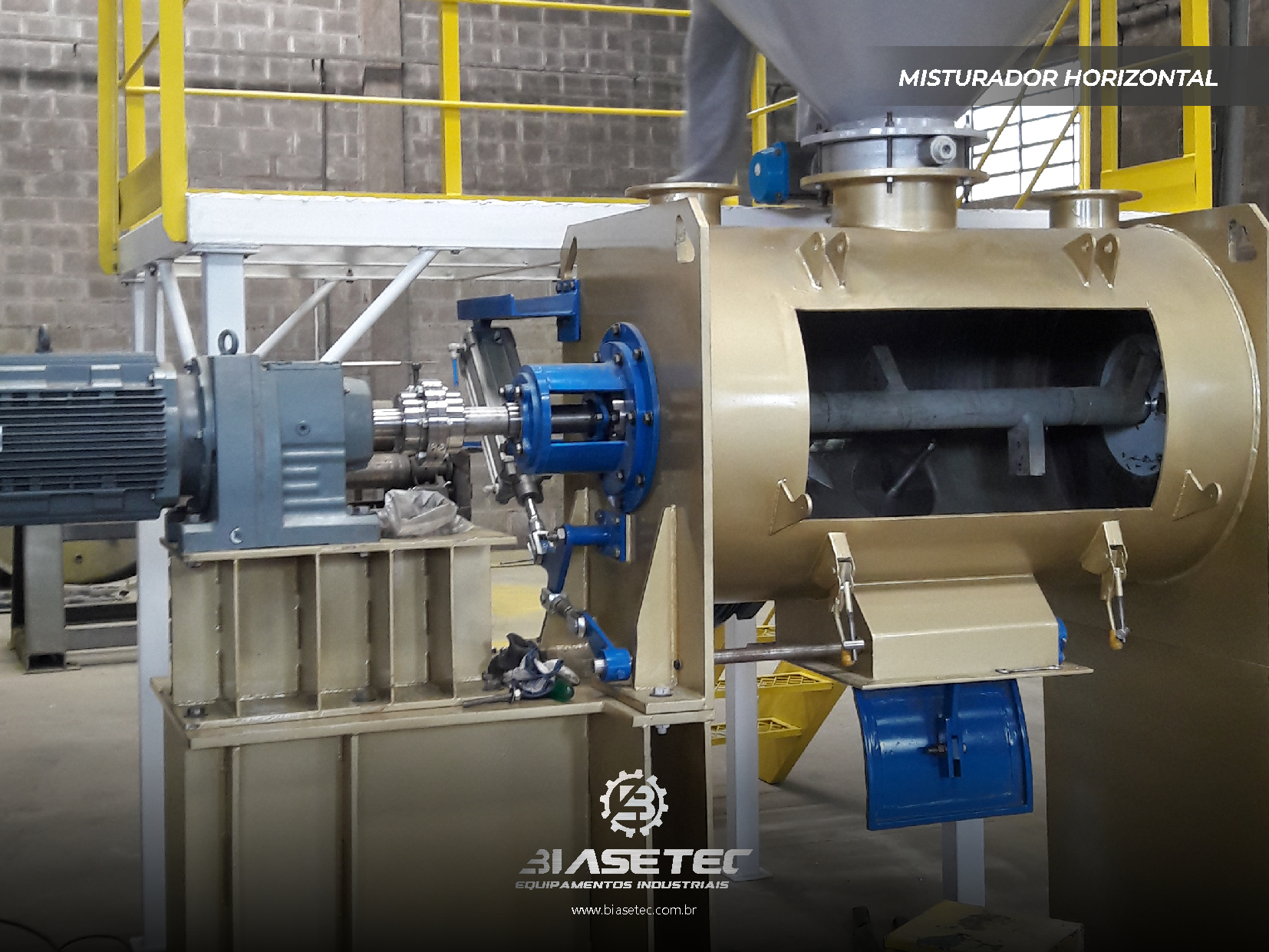 Misturador de baixa intensificação, ideal para pós leves e com boa fluidez. Também funciona como reservatório dinâmico para produtos que empedram ou possuem densidade e granulometria distintas. Pode incluir moegas, plataformas, guarda-corpo, telas, raspadores sistema de exaustão, conforme o projeto.