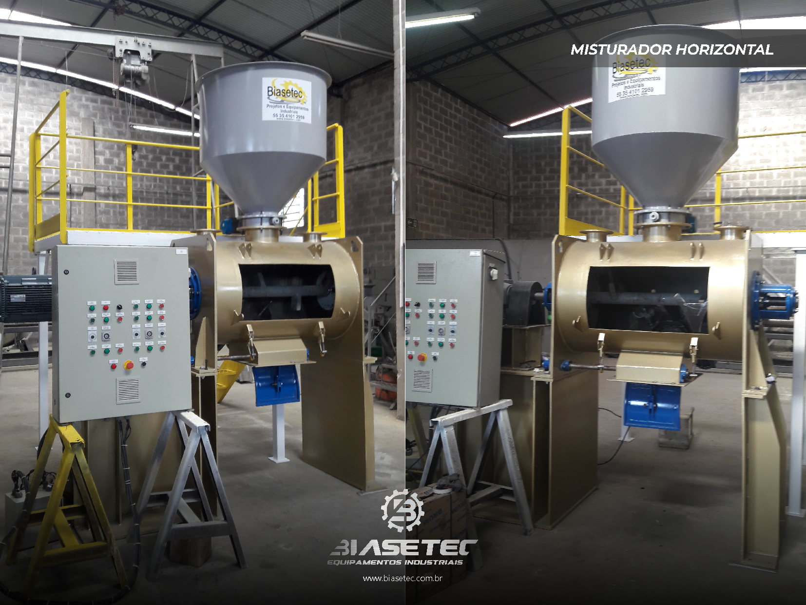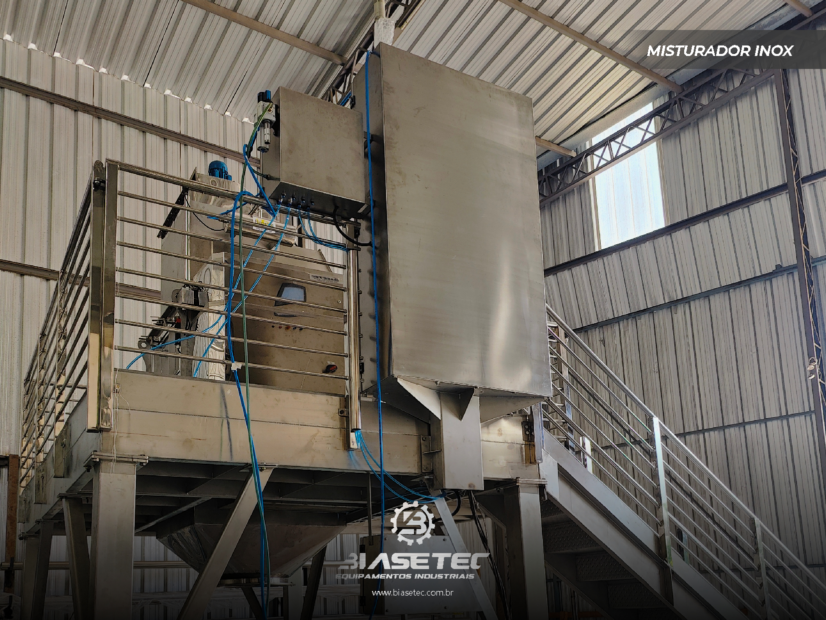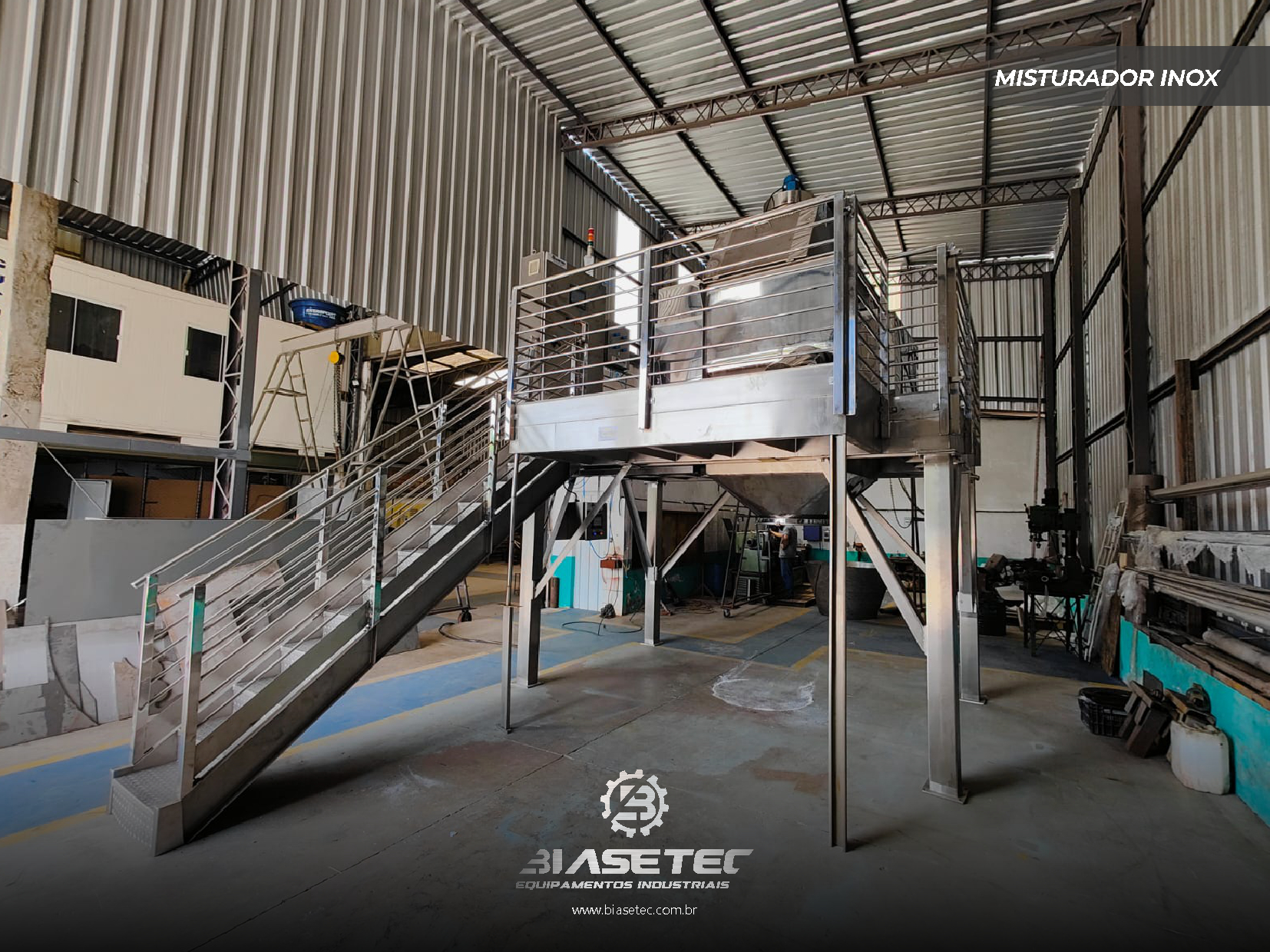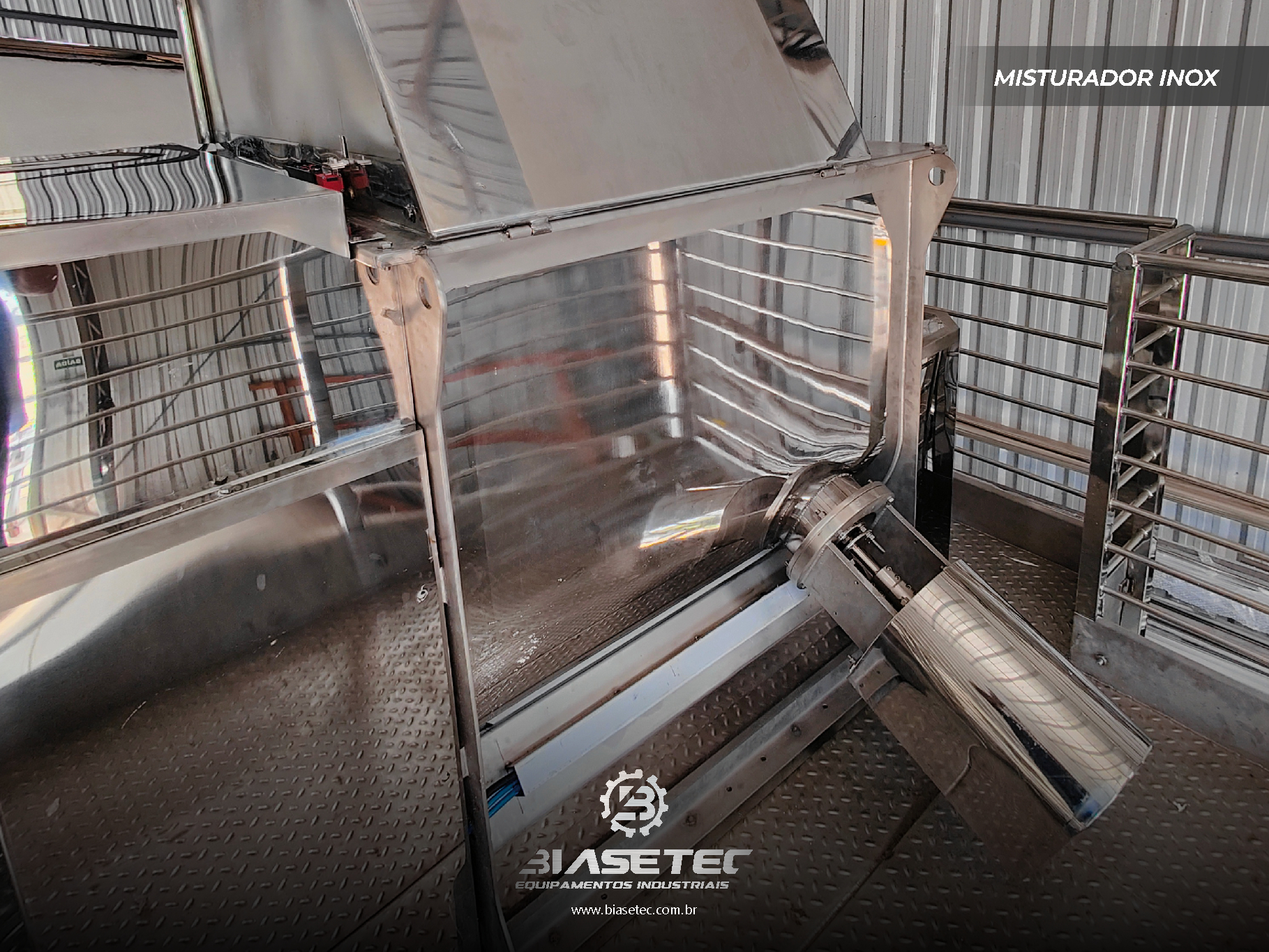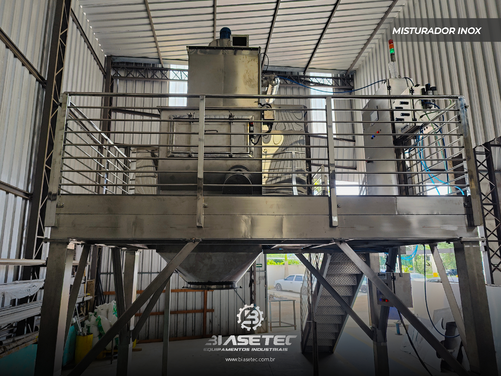 Misturador de baixa intensificação, ideal para pós leves e com boa fluidez. Também funciona como reservatório dinâmico para produtos que empedram ou possuem densidade e granulometria distintas. Pode incluir moegas, plataformas, guarda-corpo, telas, raspadores sistema de exaustão, conforme o projeto.
