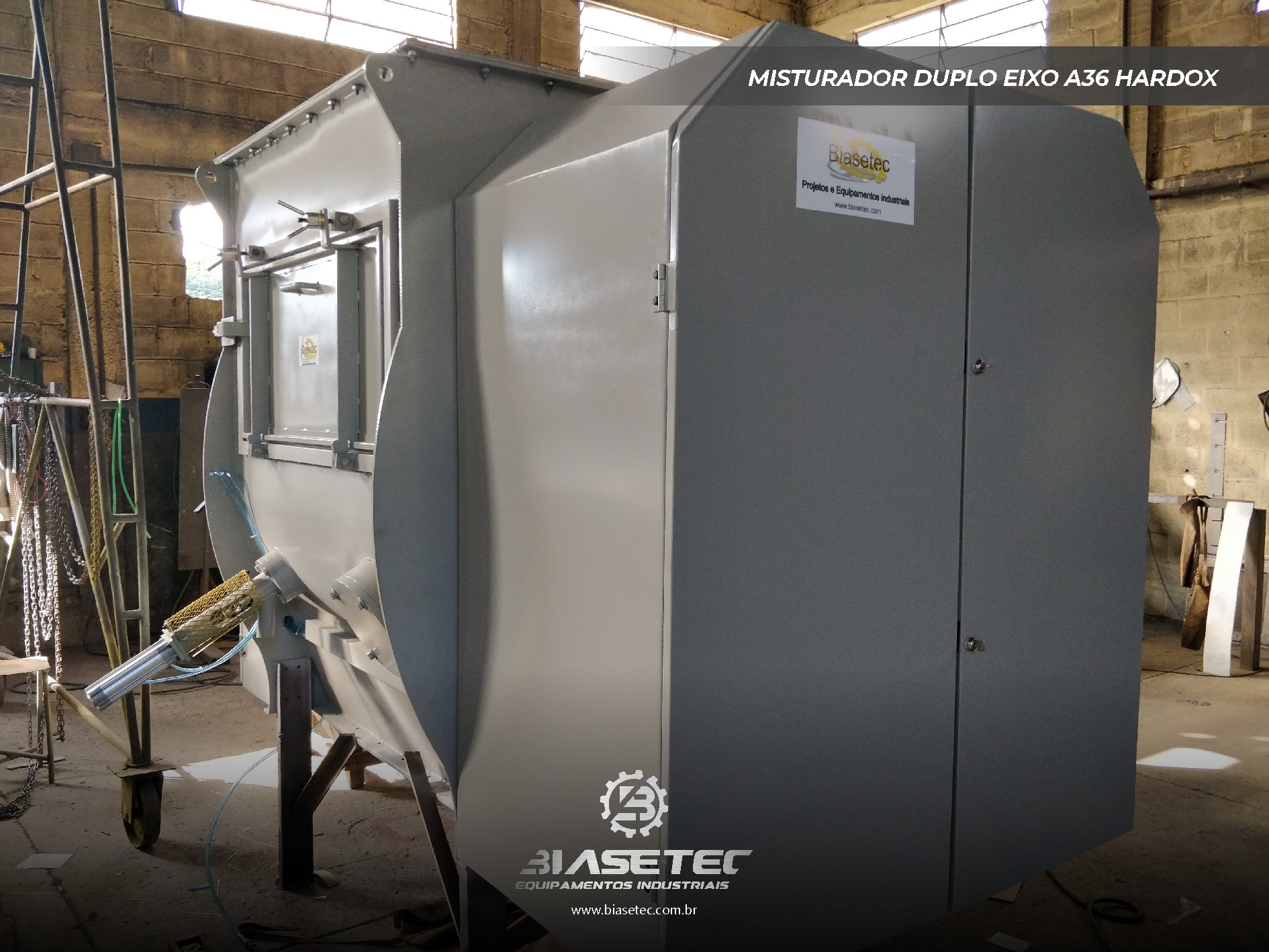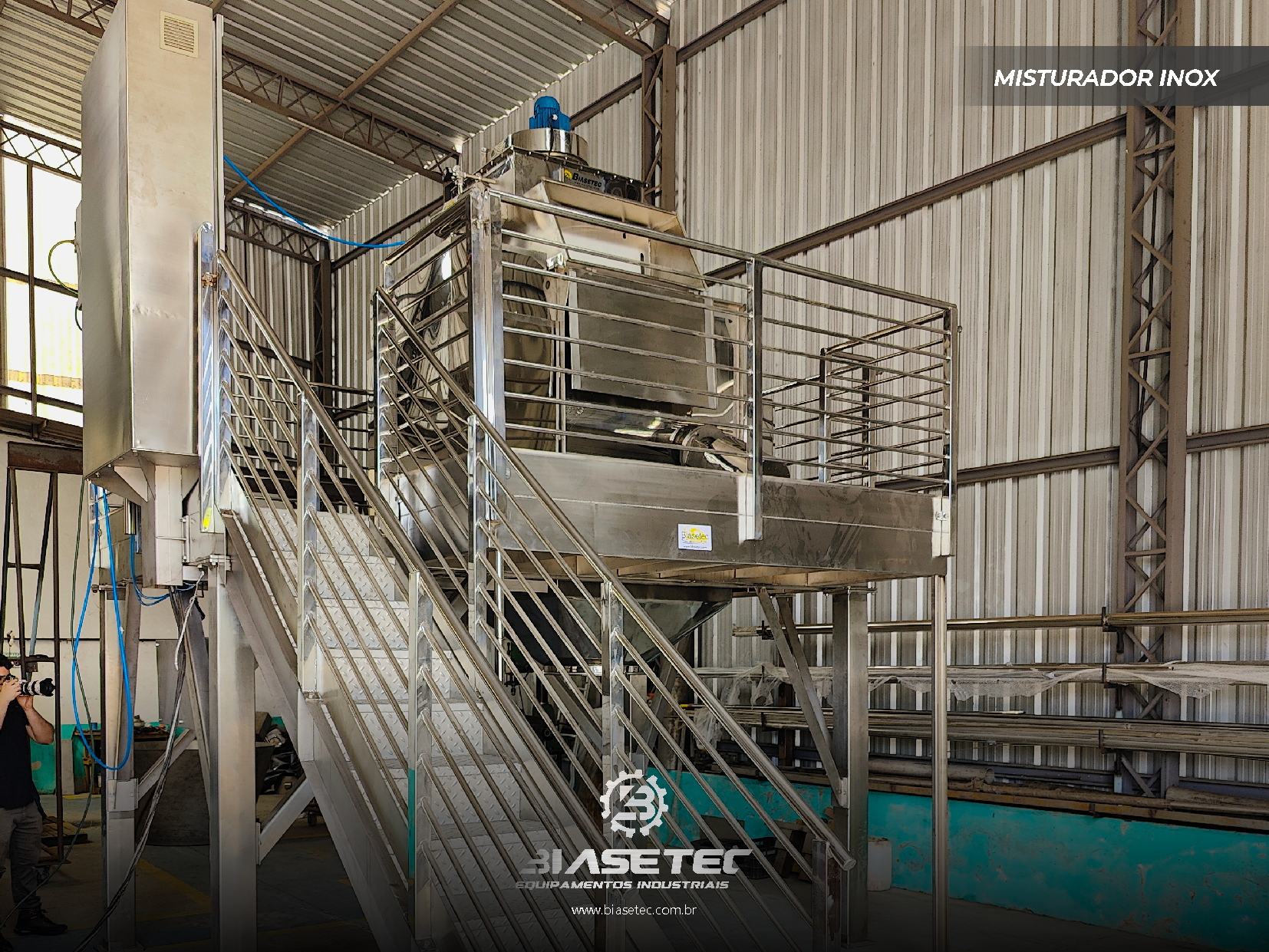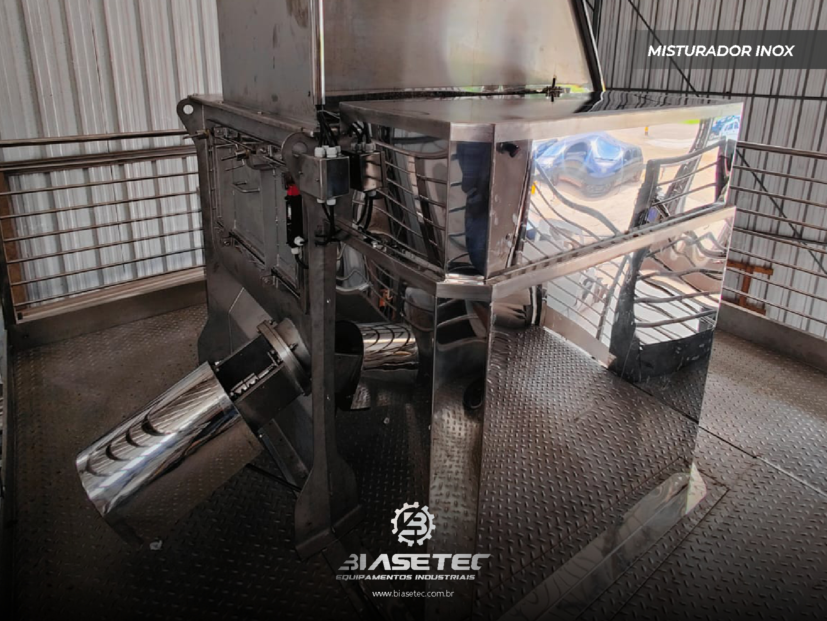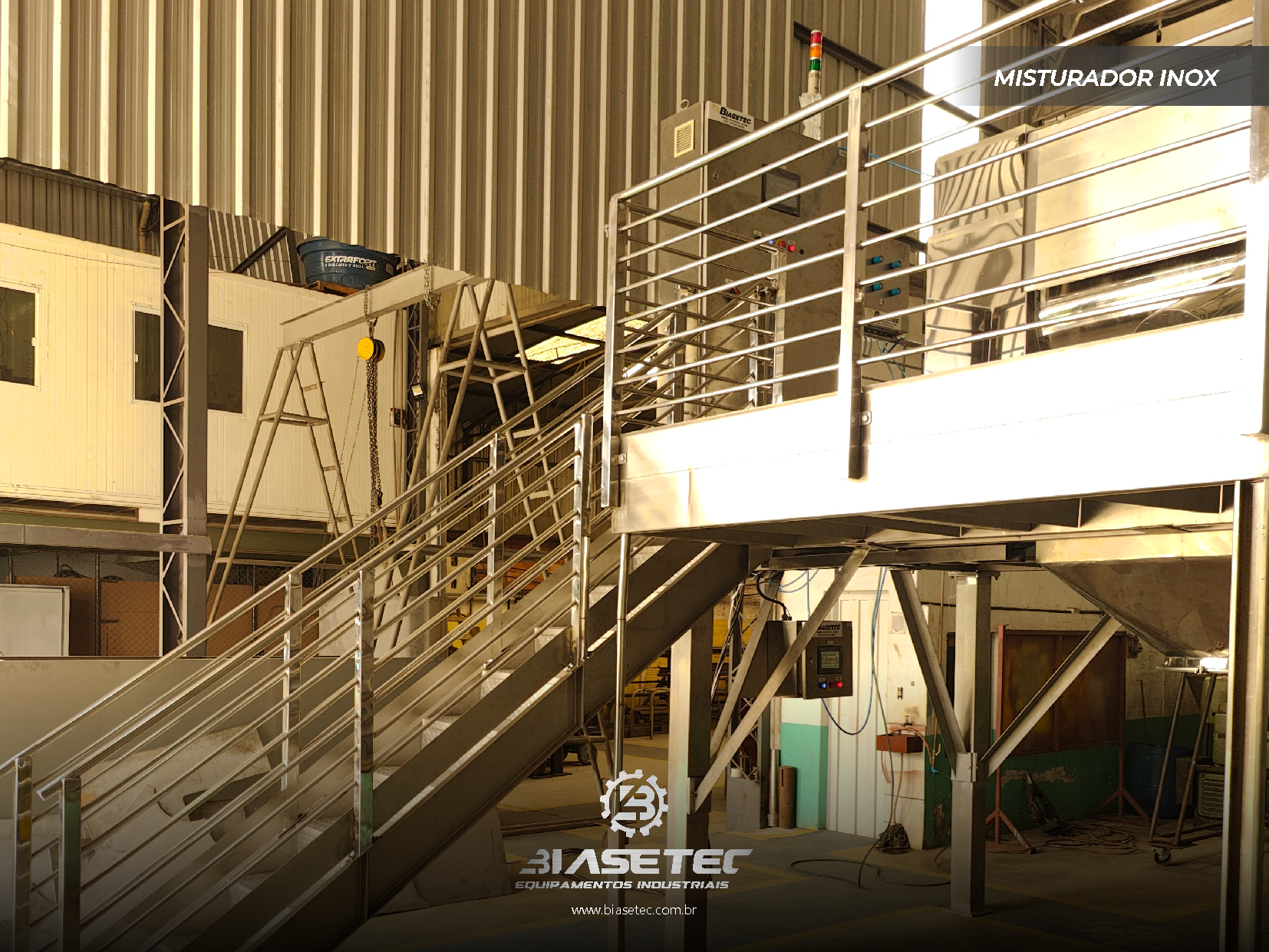 Misturador de baixa intensificação, ideal para pós leves e com boa fluidez. Também funciona como reservatório dinâmico para produtos que empedram ou possuem densidade e granulometria distintas. Pode incluir moegas, plataformas, guarda-corpo, telas, raspadores sistema de exaustão, conforme o projeto.