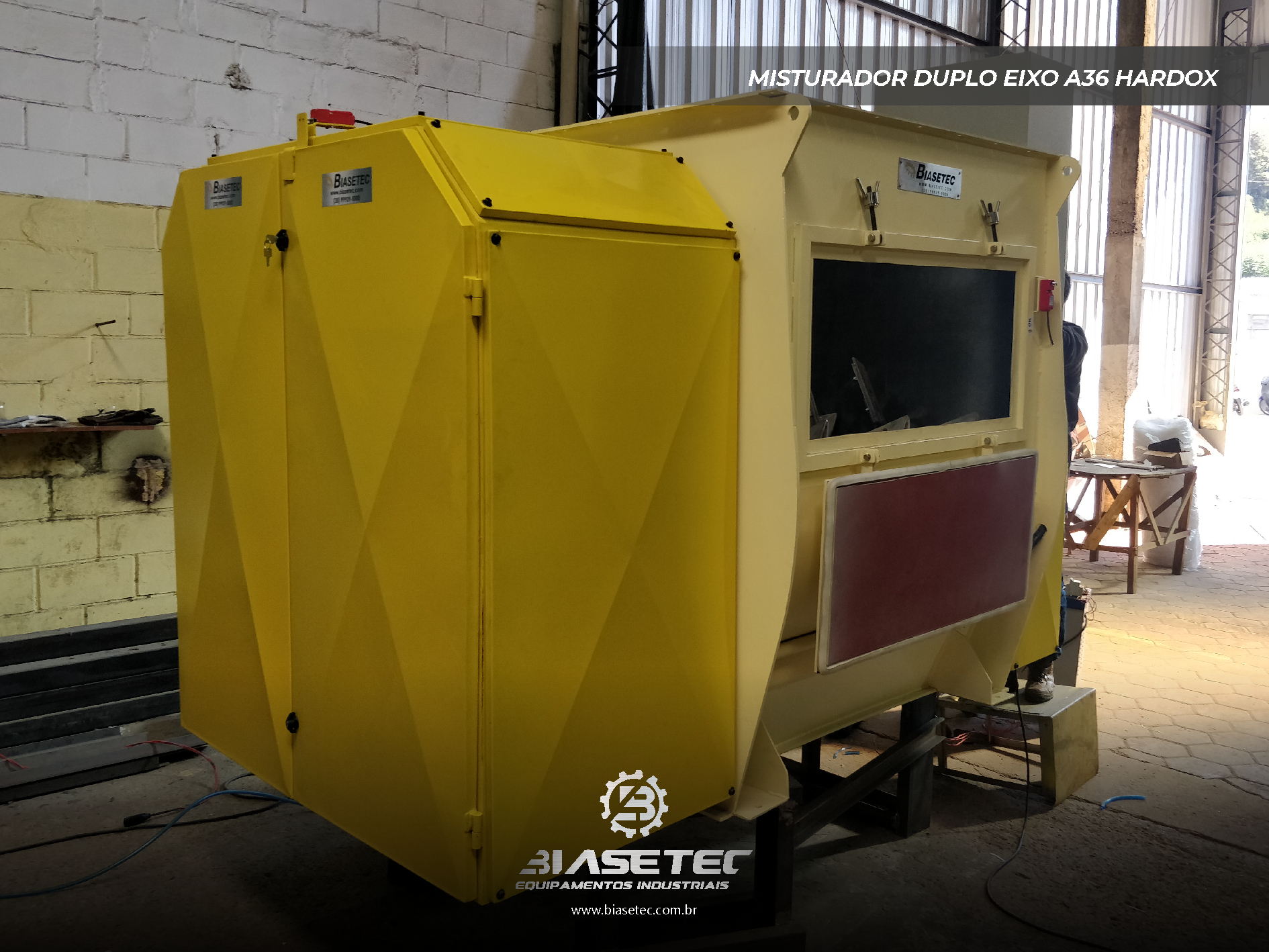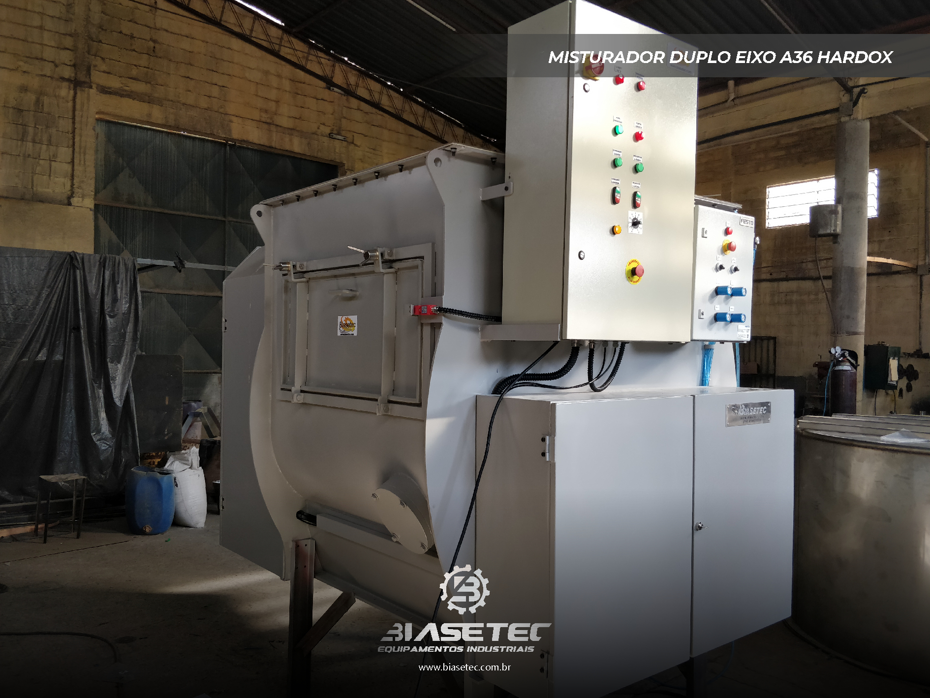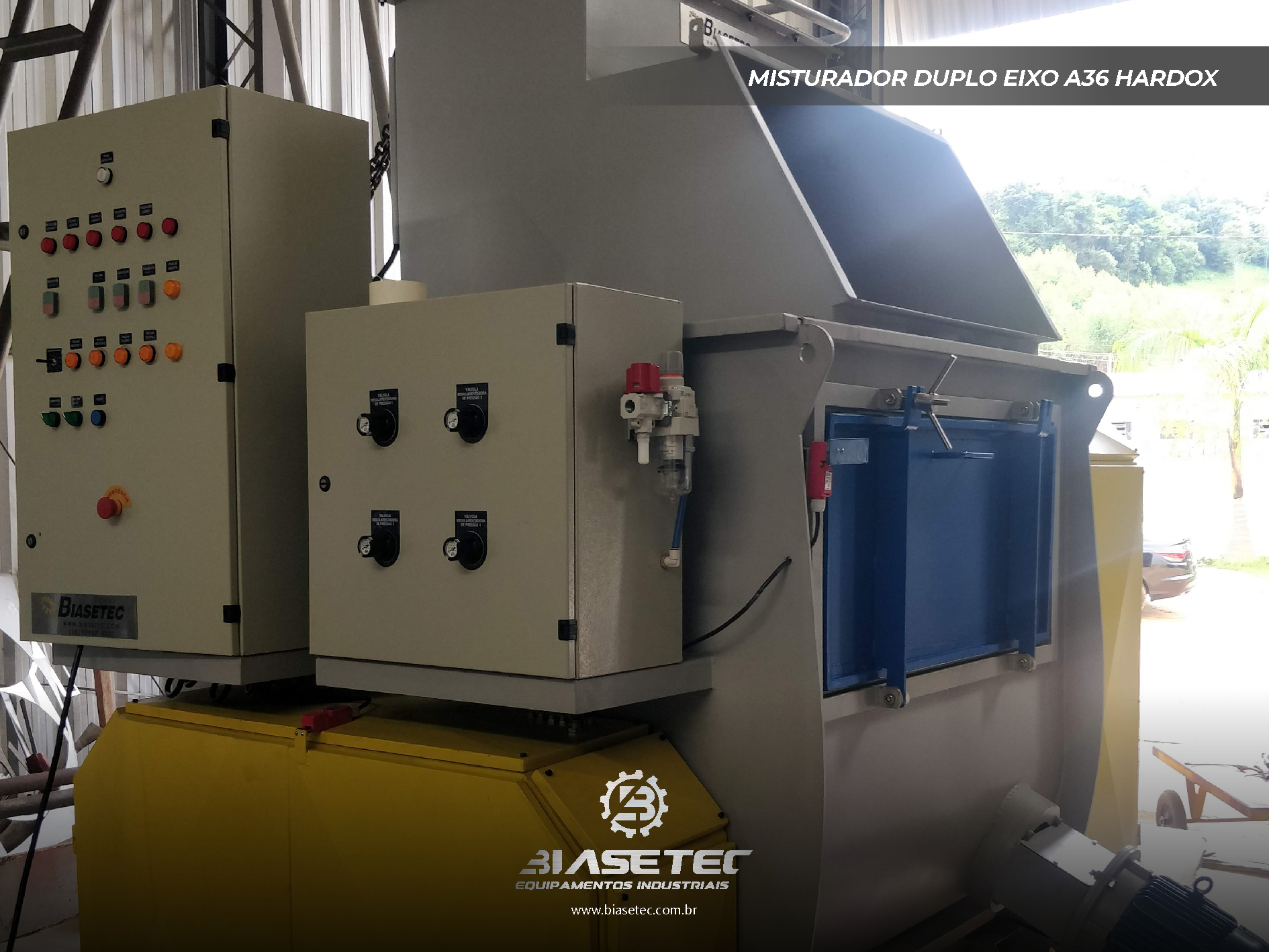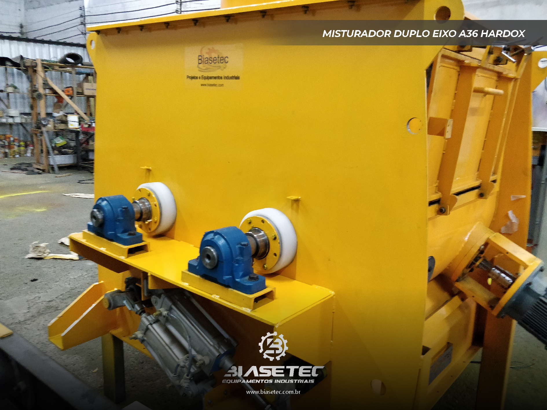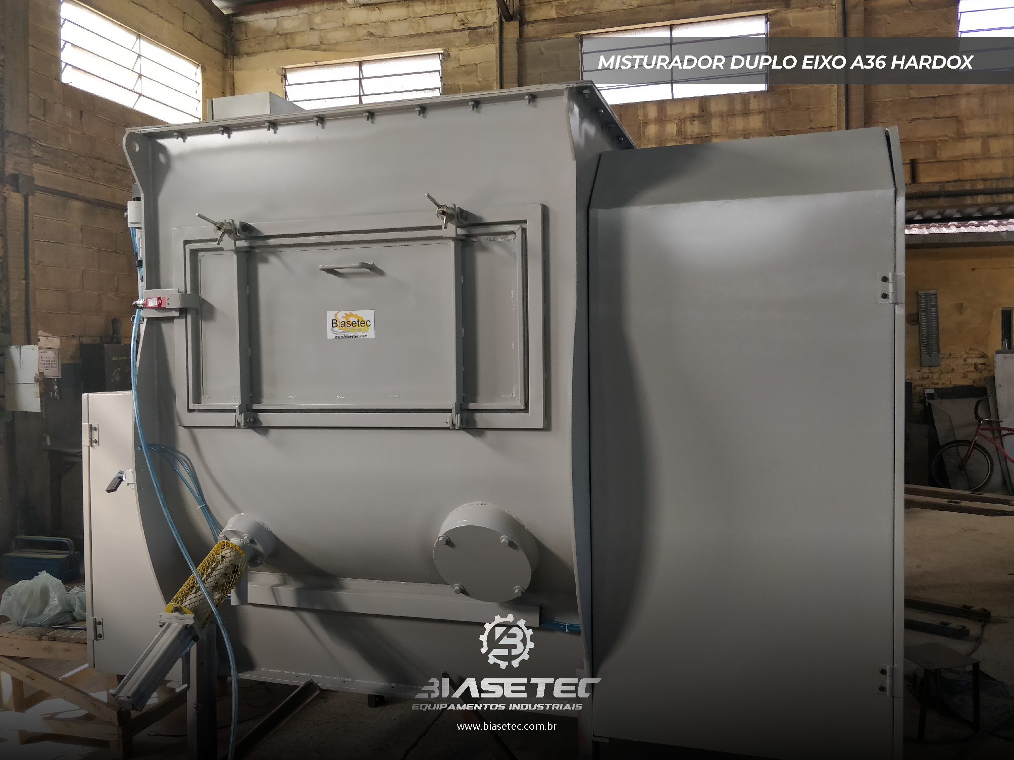 Misturador de baixa intensificação, ideal para pós leves e com boa fluidez. Também funciona como reservatório dinâmico para produtos que empedram ou possuem densidade e granulometria distintas. Pode incluir moegas, plataformas, guarda-corpo, telas, raspadores sistema de exaustão, conforme o projeto.